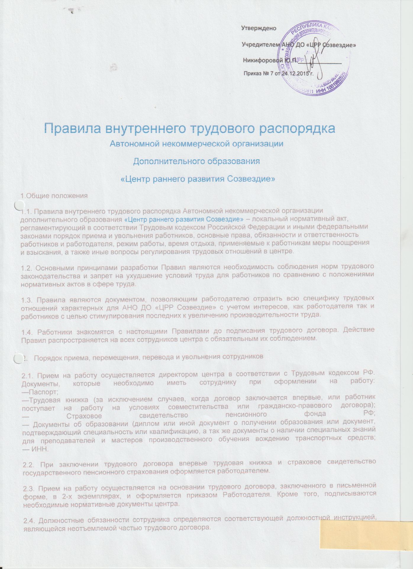 «Центр раннего развития Созвездие» (далее - Центр), разработаны в соответствии с законом «Об образовании в Российской Федерации» № 273-ФЗ, Уставом и правилами внутреннего распорядка.